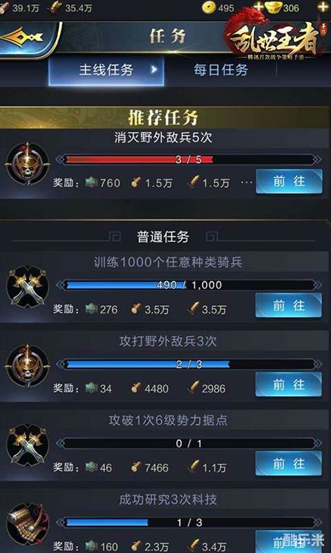 初来乍到的我们,在进入游戏以后除了指引任务还有推荐任务、主线任务以及每日任务等。而每种任务都能获得大量的经验,这里要注意的是,每日任务要活跃度达到一定的阶段才能获得经验。同样在主线任务里,分为推荐任务与普通任务,推荐任务能获得更多的经验与资源,各位主公可以优先完成推荐任务,而普通任务不用刻意去完成,只需要跟着进度去做即可。