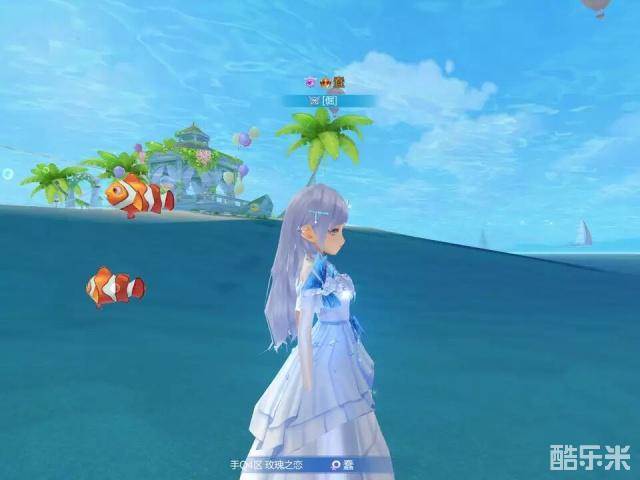 这位女玩家有幸卡到了海底拍照,可见海底世界还是非常漂亮的,四周有小鱼为伴,妥妥的深海公主范儿,海水与天空一体,看着可以净化心灵,忘掉女装大佬的不愉快,哈哈哈。