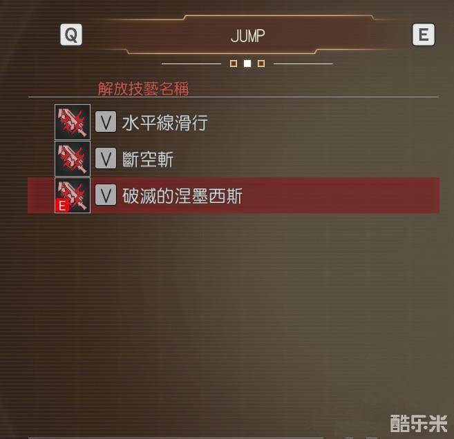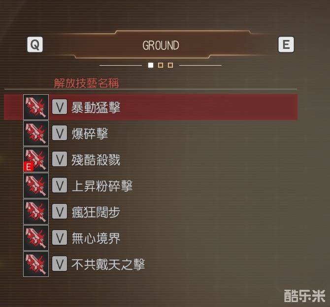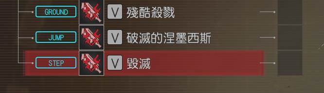 本作近战武器解放技包含三大类,分别为:GROUND(地面技),JUMP(跳跃技),STEP(垫步技)。