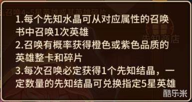 先知出品,必出精品!在先知圣殿,冒险家可以通过消耗先知水晶召唤特定属性的英雄,召唤有概率获得橙色或紫色品质的碎片甚至整卡!