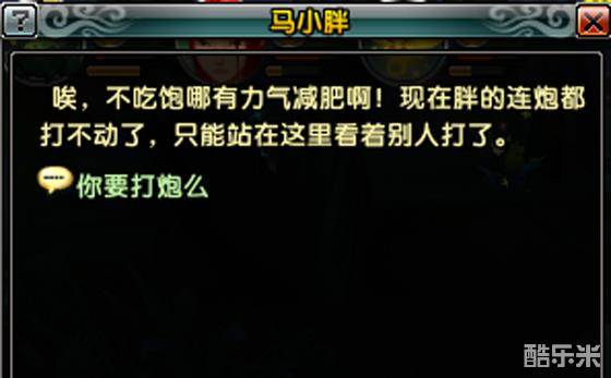 任务的背景是找到一个NPC接任务,那个NPC会请玩家去帮助马小胖。等玩家找到马小胖,马小胖会说:“唉…我太胖啦,连炮都打不动了,你能帮我么?”然后玩家就要点击:“我来帮你打炮……”
