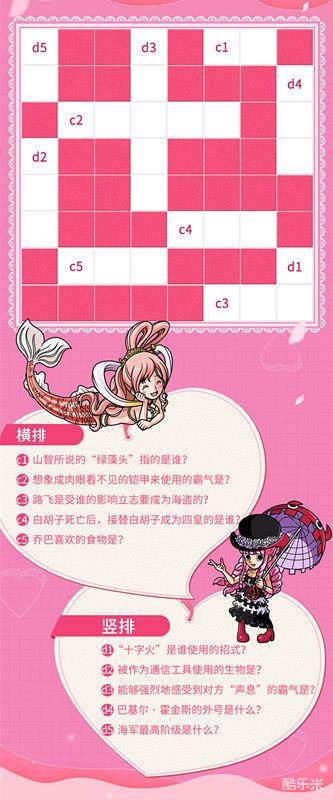 2019年2月12日0:00-2月14日23:59活动期间,《航海王启航》会在官方微信公众号推送线索提示,玩家们根据提示找到答案并在公众号中回复,即可获得一份由游戏官方精心准备的情人节礼物。具体的填字题目如下图所示,相信对真正的OP铁粉来说难度并不算太高,来看看你能答对多少吧!