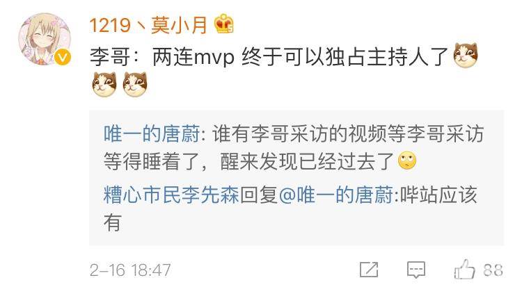 在比赛结束后,粉丝们也在SKT官方微博下留言,一个粉丝说:久违的MVP,并且配上了三个大哭的表情,看来是李哥的铁杆粉丝了,看到李哥终于拿到MVP都激动得不行。当然也有粉丝调侃说:李哥两连MVP,终于可以独占主持人了。但没想到李哥在接受采访时完全是一副严肃脸啊,也许是因为主持人不是恩静吧!
