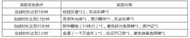 活动内容:活动期间,玩家登录游戏,在线时长达到活动条件,即可领取对应奖励。