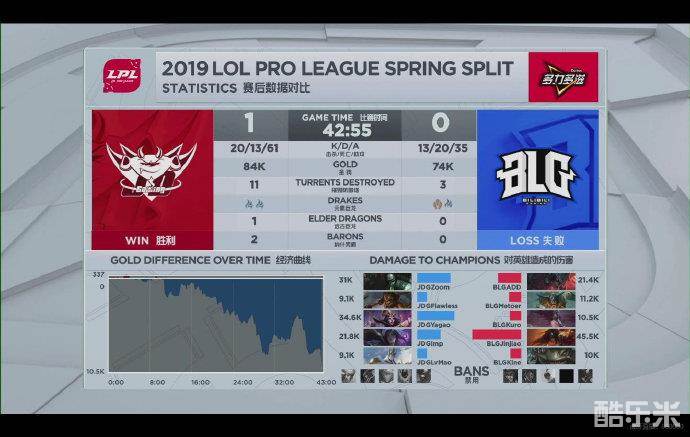 最终,JDG顺利摧毁BLG的三路高地,拿到首局比赛的胜利。
