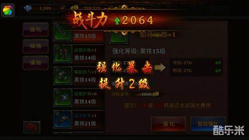 这里建议大家,在初级阶段对装备的强化要选择适度“自动”,单级强化升到够用就好。因为如果把低级别的装备升到满级,很有可能在换更高级别装备的时候没有足够的提升金币。