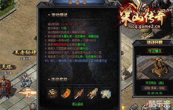1、在游戏中,神威狱是一个定时活动,每天13:00-14:00开启,活动期间玩家可通过NPC“神威狱看守者”进入活动场景,坐标是比奇城【156,122】;