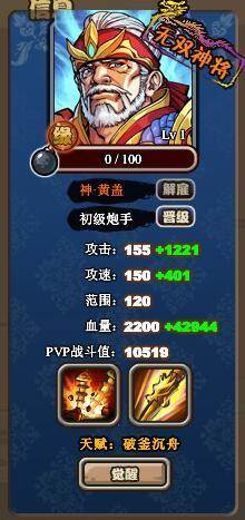 PVP技能:【血溅十步】神·黄盖濒死时给予对方强力一击(攻击力与武将血量有关)