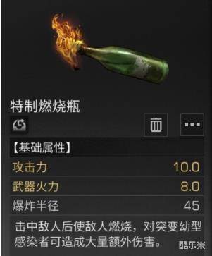 在游戏中,特制燃烧瓶属于特效武器,击中敌人后能够给敌人造成高额的爆炸输出伤害,适用于放置在家中以备拆家的敌人,可以获得比较良好的作战效果哦~