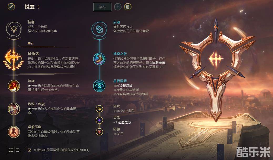 副系选择启迪系,鞋子+星界洞悉是最好的选择,鞋子是启迪系中性价比最高的符文,而星界洞悉则是锐雯满CD的关键,45%CD还是很有必要的。