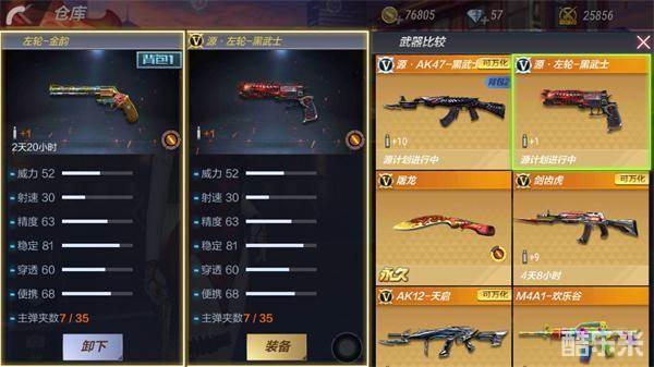 如图,左轮-金韵和英雄级武器的皮肤枪——源左轮-黑武士(橙色)相比,两者并无属性上的差距。并且,因前者换弹速度少于后者0.05S,实际操作价值强于后者。