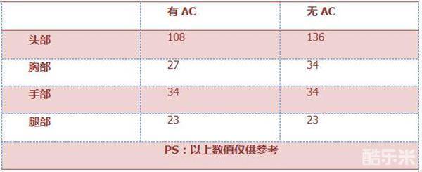 根据上述信息,我们可以看出:剑齿虎伤害低于AK、高于M4,即:无论目标有无配置AC、命中头部都必然秒杀。其次,若目标配有AC,那么命中胸部需4枪,反之3枪,其他保持一致。