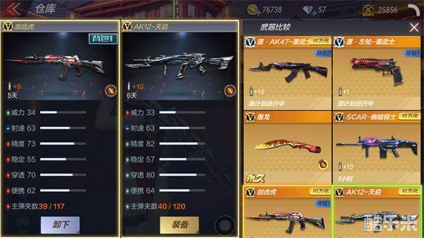 如图,剑齿虎和同品质的AK12-天启相比,前者威力高于后者、射速等同,其他皆弱于后者,即:论输出伤害,前者占优;论续航和射击精度,后者占优。