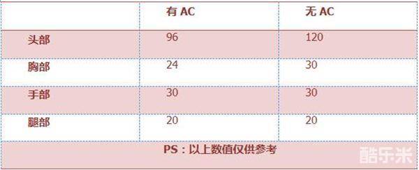 根据上述信息,我们可以看出:目标若未配置AC,命中头部一枪瞬秒、胸部4枪,其他4~5枪;反之,目标若配置有AC,那么命中头部需再次补枪、胸部5枪,其他4~5枪(由此看出:配置AC真的很重要)。