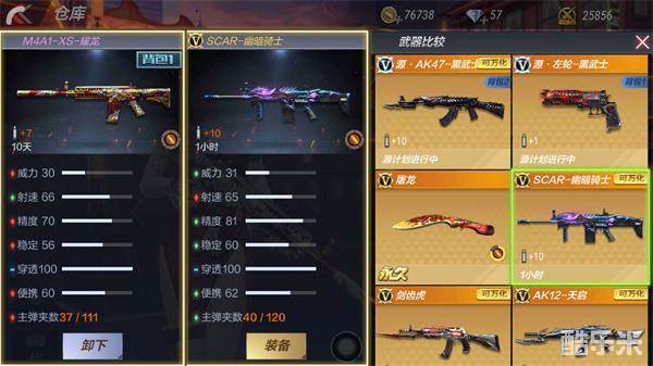 如图,M4A1-XS-耀龙和英雄级武器——SCAR-幽暗骑士相比,前者除射速高于后者、穿透持平后者外,其他皆逊于后者,即:两者不具备可比性,后者更为强势。