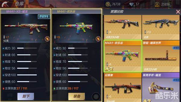 如图,M4A1-XS-耀龙和橙色品质的M4A1-欢乐谷相比,前者除主弹夹数稍低于后者外,其他核心数据和后者等同,即:论作战效果,两者相同;论续航时间,后者占优。