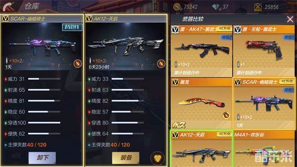 如图,SCAR-幽暗骑士和同为英雄武器的 AK12-天启相比,前者威力、精度、便携低于后者,射速、稳定和穿透高于后者,其他保持一致,即:论伤害、输出命中率,后者占优;论压制和穿透效果,前者占优。