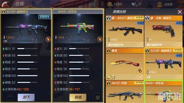 如图,SCAR-幽暗骑士和橙色武器M4A1-欢乐谷相比,前者射速低于后者,其他全面领先后者,即:两者不具备可比性,无论是哪些方面。