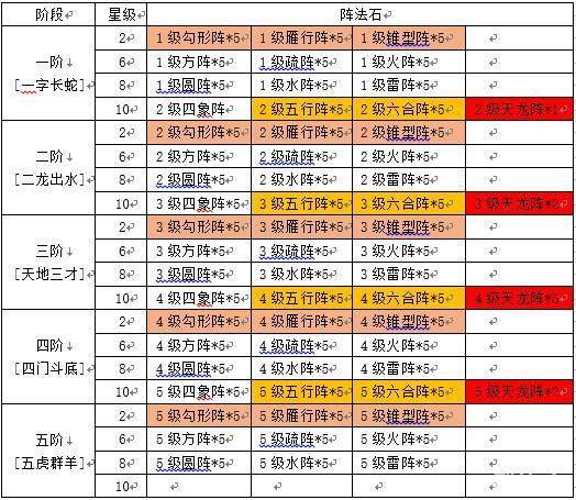 举个例子:我要从一阶10星升到二阶10星,其中升阶所需要的2级阵法石直接套用专家(即2级五行阵2级六合阵)配方合成就可以了,在合成过程中,第一类的石头会慢慢出现,当你凑够2级五行阵和2级六合阵各5个的时候,整个二阶所需的阵法石基本凑够,而且有些阵法石会多出来