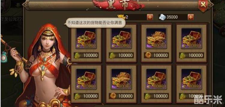 每次你可以花费10万粮草购买8万的铜钱,或者花费10万的铜钱购买8万的粮草。全部商品购买完后,可花费若干元宝刷新黑市中的所有商品。