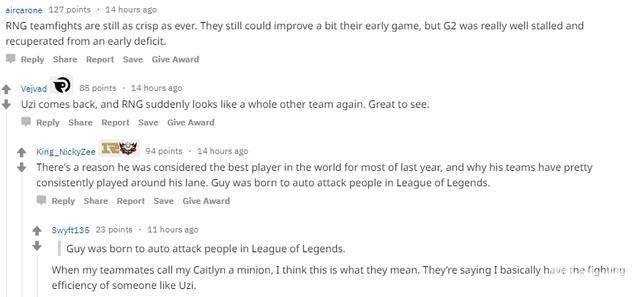 - "Uzi回来后,RNG战队突然看起来就像是另一支队伍,很高兴看到他们。"
