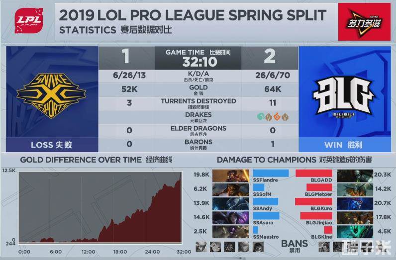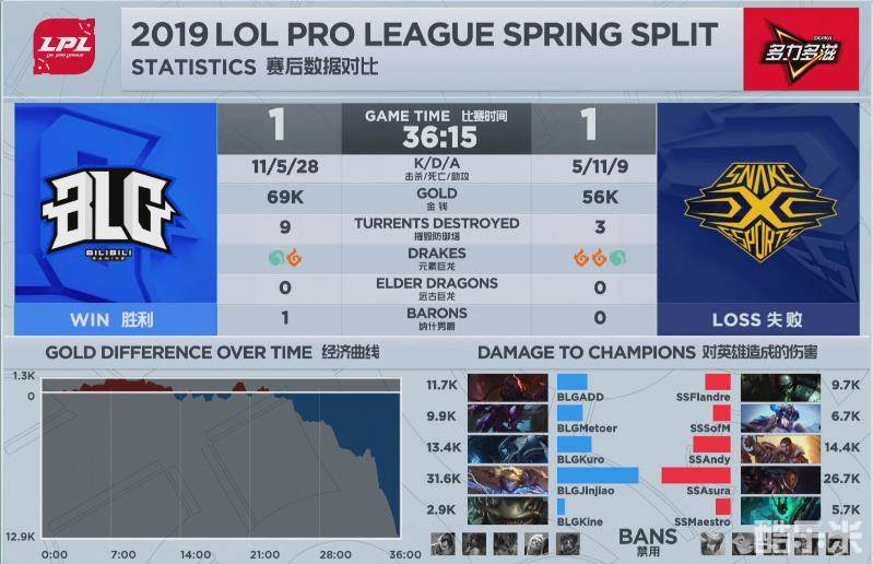 双方均是选出前中后期均衡发力的阵容,BLG的节奏点在于上下路,而Snake是以中野带节奏为主,比赛开始双方打野常规开局。比赛的前期,双方均是以平稳的发育为主,Snake的节奏处理更加优秀一些,取得了初步的领先。但是,Snake一波转线决策失误,被BLG拿下一血塔,双方前期处于僵持状态。比赛的中期,BLG将阵容优势发挥了出来,通过中野配合抓边顺利拿到第一条大龙开始推进扩大经济领先。但此后Snake凭借着下路组合的发挥,扛住了BLG带来的压力,接连的控到接下来的两条大龙,将节奏找回。双方进入一段时期的僵持期,最终,Snake把握住了机会,通过野区入侵开团将BLG三人击杀,直接中路推进赢下首局!