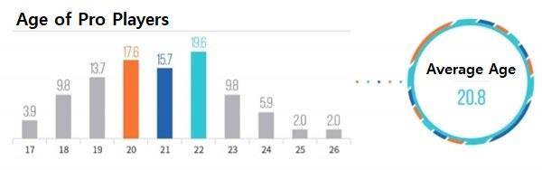 LCK的职业选手都非常年轻。根据2017年的统计,选手的平均年龄为20.8岁。其中22岁的选手占19.6%而20岁的选手占17.6%。相比之下,达到23岁的职业选手只有9.8%。大家都知道25岁左右时职业选手的技术水平会有明显的退步;2017年时,30岁左右的职业选手是不存在的。