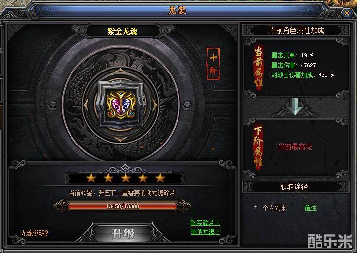 七阶五星:龙魂碎片消耗2560,暴击几率15.7%提升至15.9%,暴击伤害从25770到26988,对战士伤害加成:+16%。