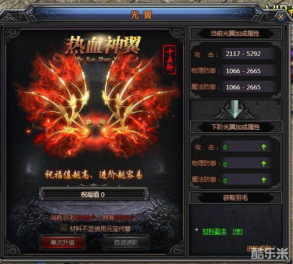 升级光翼,那么玩家就需要凑足相应的祝福值。祝福值的筹集需要消耗羽毛的。所以说羽毛的获得十分关键。收集羽毛目前在游戏中有两种方法,一种是参加两次镇魔神殿副本,还有就是用元宝来代替羽毛。