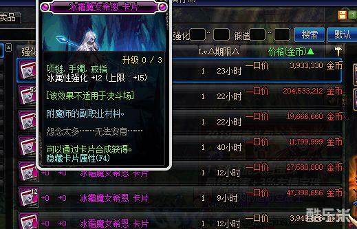 有的满级的稀有级紫卡,而有的是可以继续升级的神器级的粉卡,虽然有的两者有时属性一样,但价格差距却也不小。当然,紫卡的属性一般都不算太好,所以这里比较适合一些小号过渡的附魔卡了。如95版本的白图卡片兔女郎伊伦丝,属性升满为12全属强,价格却才110w金币。