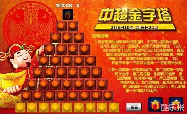 1、玩家从金字塔最底层开始翻牌,每一层翻牌所消耗的金币也不同,花费明细如下: