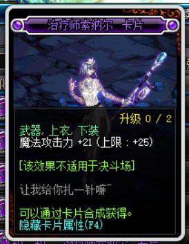 物攻魔攻卡仍相对上版本有一定提升,且售价较低,同样推荐更换。其中,魔攻卡名为治疗师索纳尔,升级两次后提供25攻击力,售价20w,物攻卡名为飞剑吉利亚德,售价22w金币。