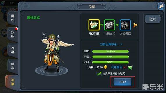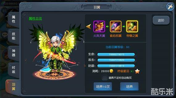 当该等级的羽翼培养完毕后,点击进阶即可给羽翼进阶故提升羽翼等级