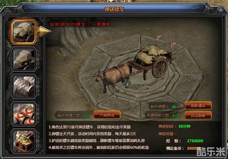 在XY游戏《梁山传奇》里面,玩家只要将镖车从比奇城林捕头处押送到封魔谷李捕头处,奖励大量经验以及金币奖励。镖车等级不同押镖路线也有一定的区别,押送的镖车等级越高,路线也越远,获得的奖励也越好。押镖的过程中可谓是小有难度,因为你不仅仅需要保证货物的安全,同时还要抵御其他玩家前来劫镖。
