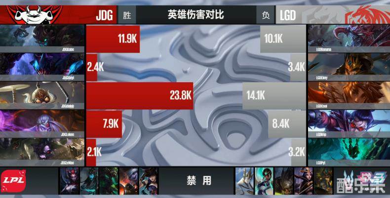 拿下大龙后,JDG快速的推塔拿经济,快速的滚起雪球。最终,随着牛头的一波终极绕后,让LGD前后排脱节,JDG逐个击破将LGD团灭,随后一波结束了比赛,首局先下一城!