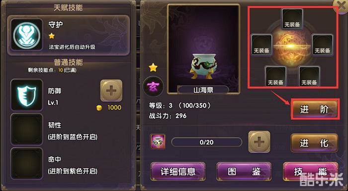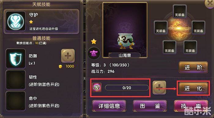 技能升级:每次法宝升级可以获得技能点,道友可消耗法宝技能点和少量金币,为法宝的普通技能升级。