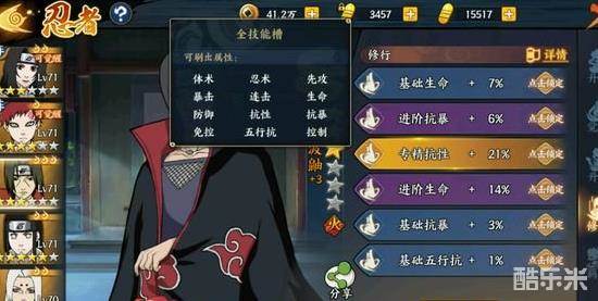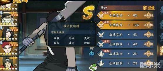 目前,推荐大家洗练的属性有三种,【属性攻击】【免控】【先攻】这三种对忍者的提升是存在质变效果的,另外,像再不斩这种没有属性攻击,防御槽不够无法洗免控的忍者,就只能退而求其次,洗一洗体术了,或者赌一赌【暴击】【连击】的效果可以在后期修复。