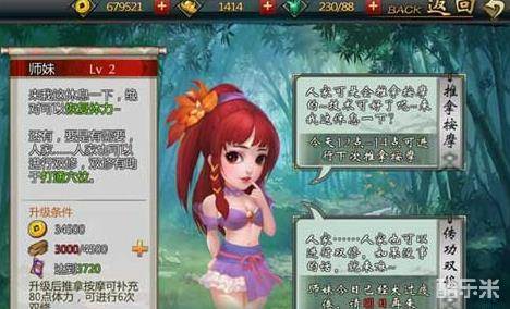 除了按摩之外我们还可以和师妹进行双修,双修不会给我们体力,但是我们可以获得玉露琼浆,玉露琼浆我们可以在竹屋内升级我们的穴位,获得体力的多少和双修的次数是要看我们师妹的等级的,我们师妹的等级越高,我们获得的体力和双修的次数也就越多。