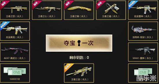 此次的王者夺宝总的来说几率还可以,尤其是幸运值较以往的活动来说更加容易获得,幸运值一旦达到100就有几率爆出极品武器,像最上面的一排王者之怒,王者之心,王者之锋,王者之魂,炫金雷神等都有一定的几率获得,想必有不少的玩家通过这个获得只花费了几百元就获得了自己心仪的王者武器了吧。