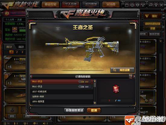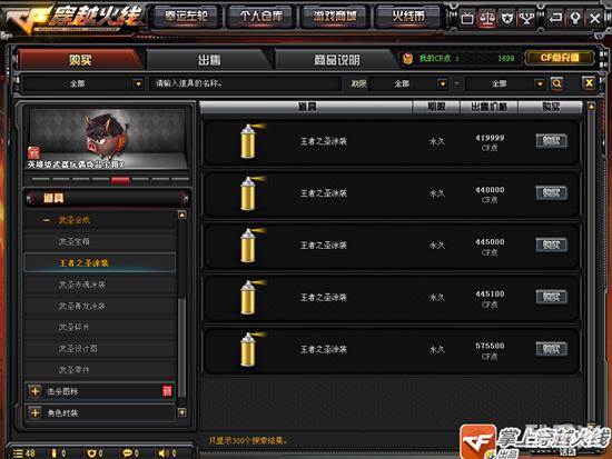 王者之圣能够一直保值的原因,那就是他只能开箱子获得或直接在交易所中用游戏货币CF点购买。而想要获得一把王者之圣的代价也非常高的,小编观察了在区域上临近的山东,华北和河南这三个大区,发现王者之圣的喷涂价格大约分别为40万、30万、20万(大概与战区所在的玩家人数有关系,山东频道模式最多,而河南的最少),另外其余三件武圣碎片、设计图、零件的价格基本相同,加起来大约十万左右。