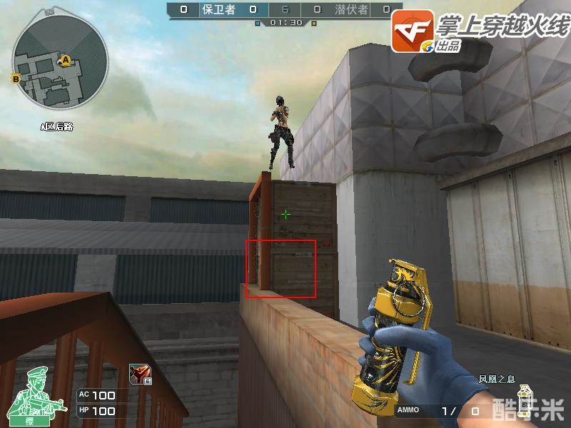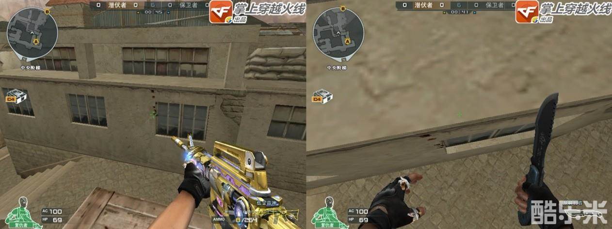架点方法也很简单,如上面两图,辅助人员枪口朝下蹲在箱子边,架点人员利用队友的人梯,到达箱子上,下面需要做的事,就是架点人员一个人需要完成的了,辅助人员可以直接去A大防守。下面介绍架点人员需要做的事情。