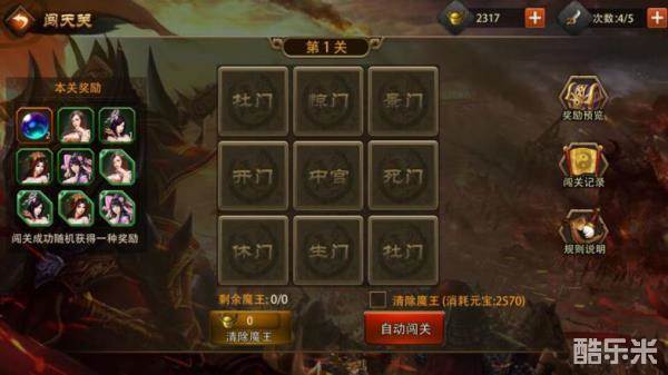3.每通过1关,下关会增加1个魔王,可以使用元宝清除魔王,增加通关成功概率