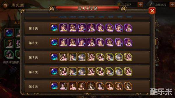 【开启】玩家达到60级开启,每日5次免费次数【玩法说明】1.闯天关总共有9关,闯天关中翻到魔王或顺利闯关9关,闯关结束