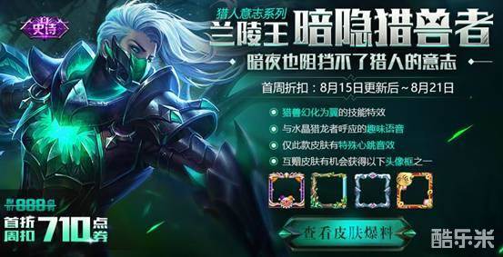 8月19日冠军杯暨暑期盛典,全民狂欢!登录游戏即可领取英雄碎片*3+铭文碎片*50,更有经验翻倍、狂欢宝藏、直售英雄全限免等精彩活动,不容错过!与水晶猎龙者同为猎人意志系列皮肤的暗隐猎兽者,登陆王者峡谷,野性律动,狩魂重燃!