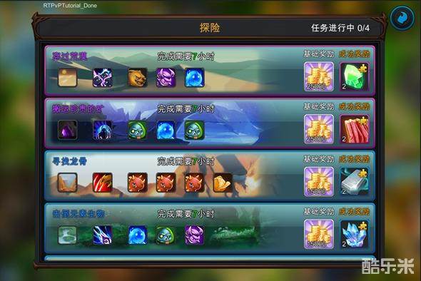 在这个界面,我们可以看到任务的名字,任务的难度(按照颜色分,由难到易分别为:紫色任务、蓝色任务、绿色任务、白色任务),任务需要的英雄类型、完成任务需要的时间(这个时间为挂机时间,即使不打开游戏也会计算时间的)、基础奖励以及任务成功后的额外奖励。