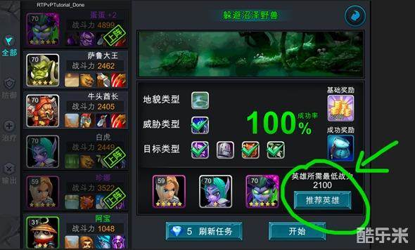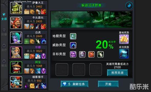 我们可以看到,完成这个探险任务对地貌类型、威胁类型和怪物目标类型有一定要求,左侧的英雄栏显示了每个英雄擅长的类型,选择符合探险任务要求的英雄可以大大提高成功率。当然,选择的英雄也要达到英雄所需的最低战斗力,否则不增加陈功率。对于不太熟悉的玩家,建议直接使用“推荐英雄”功能,系统会自动安排最合适的人选。