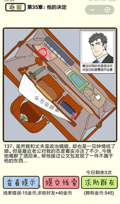 在再见吧渣男手游中他的决定第137关究竟该怎么过呢?在这一关中我们和老公是属于政治结婚的类型,但感情还是挺好的,最近发现他的态度对我们冷淡了不少,那么它有出轨的嫌疑吗?下面就来看一下吧!