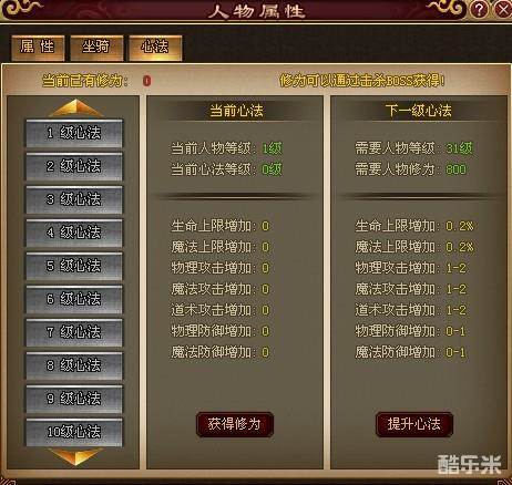 37wan《武尊》心法系统一共有五十个等级,需要玩家从一级开始修炼,慢慢增强。玩家角色等级达到31级时开启心法系统玩家需要消耗一定修为值将这一系统激活,这时玩家的心法为一级,之后心法的升级也将消耗为数不等的修为值,心法等级越高,升级所需要的修为值越多,当然,每一级心法为玩家增加的属性也会更多。修为值可以通过击杀BOSS或在商城购买“修为令牌”增加。