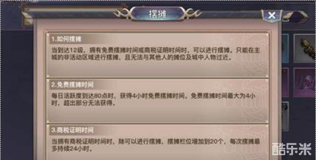 如果觉得每天仅4小时的摆摊时间不足以售卖自己的奇珍异宝,可以花费100银两换取一个商税证明道具。当拥有商税证明时间时,可以进行摆摊,每次摆摊最多持续24小时。同时,如果使用商税证明道具摆摊,还可以将摆摊栏位增加到20个,比之前的普通摆摊的栏位增加了一倍。