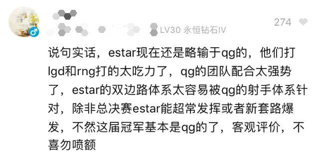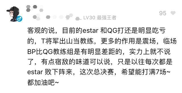 这位名为“。”的网友留言道:“eStar打QGhappy的胜算较少。原因是eStar曾战败三次心理上的压力不可能没有,QGhappy的实力大家有目共睹,英雄池深、临场应变、教练能力、团队执行力一流。这样的队伍eStar想赢太难,但依然希望他们能抛开心理压力尽情发挥,呈现一场精彩的比赛!”
